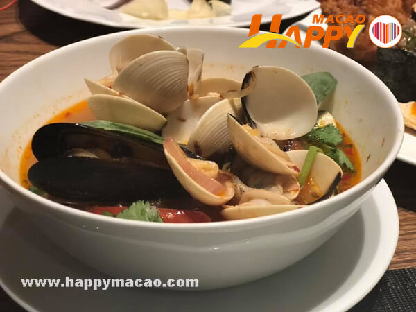 這個沙律吧有9選項、海鮮有7選頂、湯有2選項、熱盤有13選項、甜品有10選項,還有美國安格斯帶骨牛肉眼、廣東燒肉、三文魚、壽司、麵檔、沙嗲牛肉串、香葉包雞、泰式炸蝦餅等,現在7折就可享用。東南亞海鮮自助晚餐七折後優惠價 (已含10%服務費),成人澳門幣390.40元 (原價:澳門幣488元),小童 (6-12歲)澳門幣190.40元 (原價:澳門幣238元),供應時間 : 18:30-22:30,訂座電話: (853) 8801 8001。